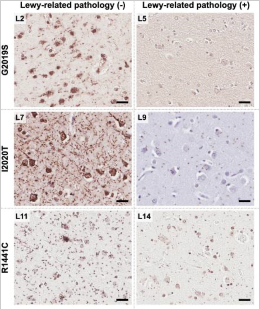 Mutations in leucine-rich repeat kinase 2 (LRRK2) are the most common cause of familial and sporadic Parkinson’s disease (PD). While the clinical features of patients with LRRK2-PD resemble those of typical PD, there are significant differences in the pathological findings. The pathological hallmark of definite PD is the presence of α-synuclein (αSYN)-positive Lewy-related pathology; however, approximately half of patients with LRRK2-PD do not have Lewy-related pathology. Lewy-related pathology is a late-stage αSYN aggregation that can be visualized with hematoxylin and eosin stains or conventional immunohistochemistry (IHC). Increasing evidence has indicated that αSYN oligomers, which represent the early-stage of αSYN aggregation, may have neurotoxicity. Visualization of αSYN oligomers requires specialized staining techniques, such as αSYN-proximity ligation assay (PLA). Distribution and severity of αSYN oligomers in the brain of patients with LRRK2-PD remain unknown. In this study, we performed phosphorylated αSYN-IHC and αSYN-PLA staining on postmortem brain sections of patients with three pathogenic LRRK2 mutants: p.G2019S (n = 5), p.I2020T (n = 5), and p.R1441C (n = 4). The severity of Lewy-related pathology and αSYN oligomers was assessed semi-quantitatively in the brainstem, limbic lobe, basal ganglia, and cerebral cortex. αSYN oligomers were detected in patients with LRRK2-PD even in those without Lewy-related pathology; a negative correlation was observed between Lewy-related pathology and αSYN oligomers (r = − 0.26 [− 0.39, − 0.12]; P < 0.0001). Our findings suggest that αSYN oligomers may represent a common pathological feature of LRRK2-PD. Notably, patients harboring p.G2019S and p.I2020T had significantly higher levels of αSYN oligomers in those without Lewy-related pathology compared to those with Lewy-related pathology. These patients also had a trend toward shorter disease duration. These results imply that in LRRK2-PD, αSYN oligomers may initially accumulate in the brain but do not progress to form Lewy-related pathology. The present study suggests that targeting αSYN oligomers may be a therapeutic strategy for LRRK2-PD even if there is no Lewy-related pathology.